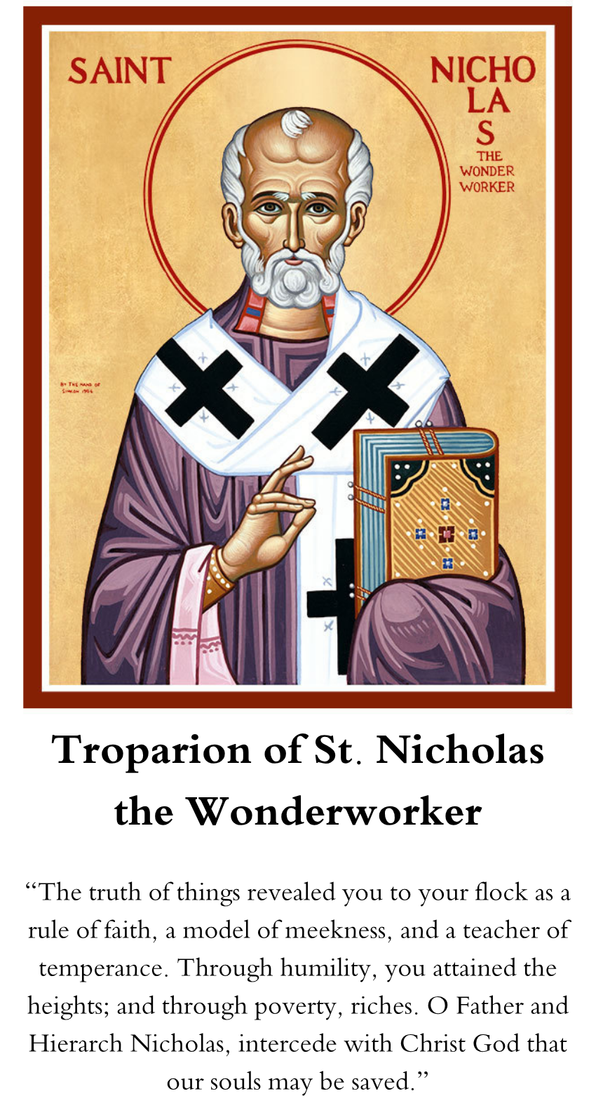 Our Holy Father Nicholas, emulator of the Apostles and ardent imitator of the Lord Jesus Christ, appears as a living pillar of the Church, zealous in defense of the faith and a model of pastoral solicitude for holy bishops. Through his countless miracles on behalf of the poor, the abandoned, of those suffering injustice and of all who call upon his fatherly protection, he has to this day shown himself “a good steward of the manifold grace of God” (I Peter 4:10).